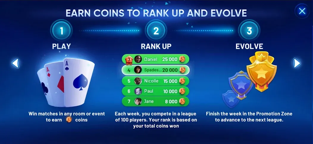 A mobile card game offering classic spades with modern features. Players compete online or offline across multiple modes, tournaments, and leagues, combining traditional rules with social systems, daily rewards, and competitive multiplayer progression.